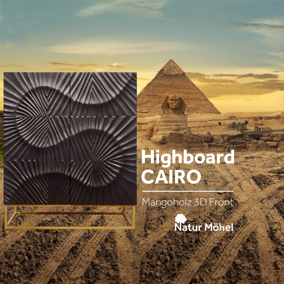 Auf einem schlichten Metallgestell in gold ruht ein massiver Korpus aus Mangoholz in einem aufregenden Dunkelgrau. Das Highlight des Boards ist jedoch ohne Frage die aufwändige 3D-Schnitzerei, die auf den vier Türen angebracht ist.