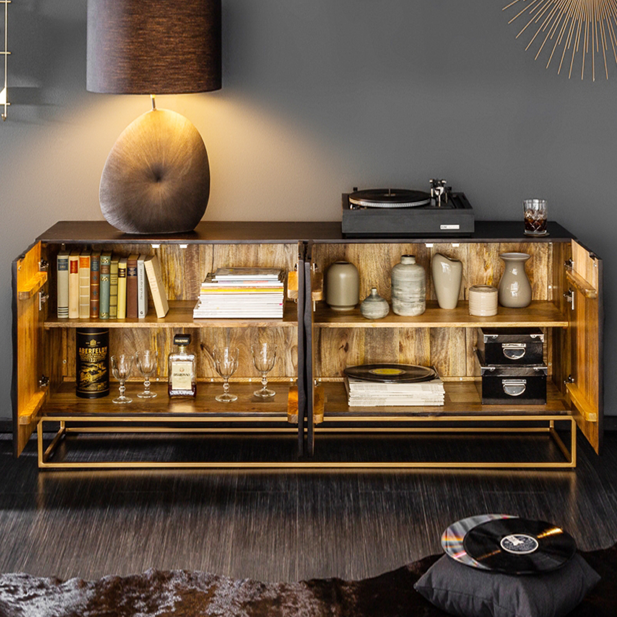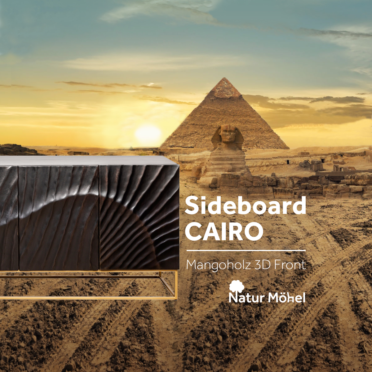 Auf einem schlichten Metallgestell in gold ruht ein massiver Korpus aus Mangoholz in einem aufregenden Dunkelgrau. Das Highlight des Boards ist jedoch ohne Frage die aufwändige 3D-Schnitzerei, die auf den vier Türen angebracht ist.